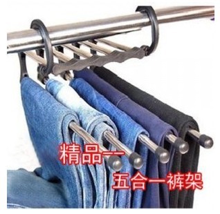 1、有两个挂钩,可以同时挂在衣橱里的横杆上。下面有五根小杆, 每根小杆可以挂1—4条裤子(裤子轻重不同,重的挂1条,轻的挂2—4条),等于总体可以挂5—20条裤子;